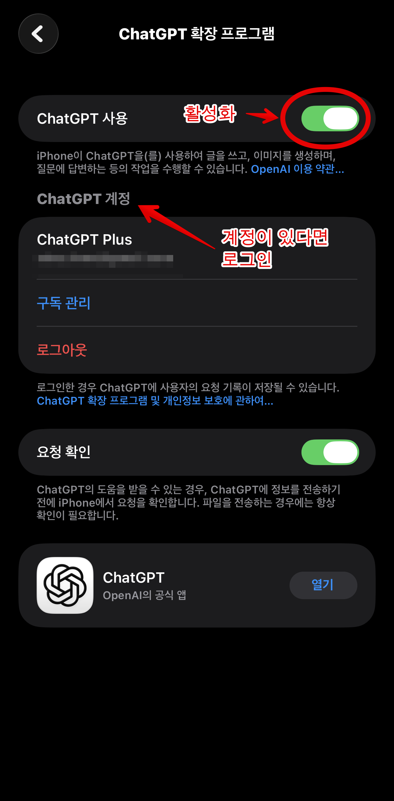 TIP: ‘공유할 때 보기’를 켜두면 웹페이지, 메모, 문서를 ChatGPT로 바로 보낼 수 있습니다. 예를 들어 “이 내용 요약해줘”라고 하면 ChatGPT가 즉시 응답합니다.